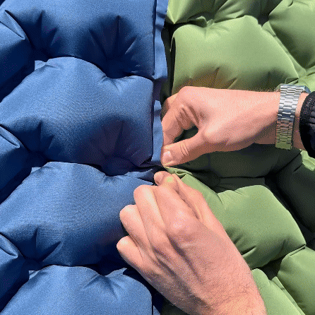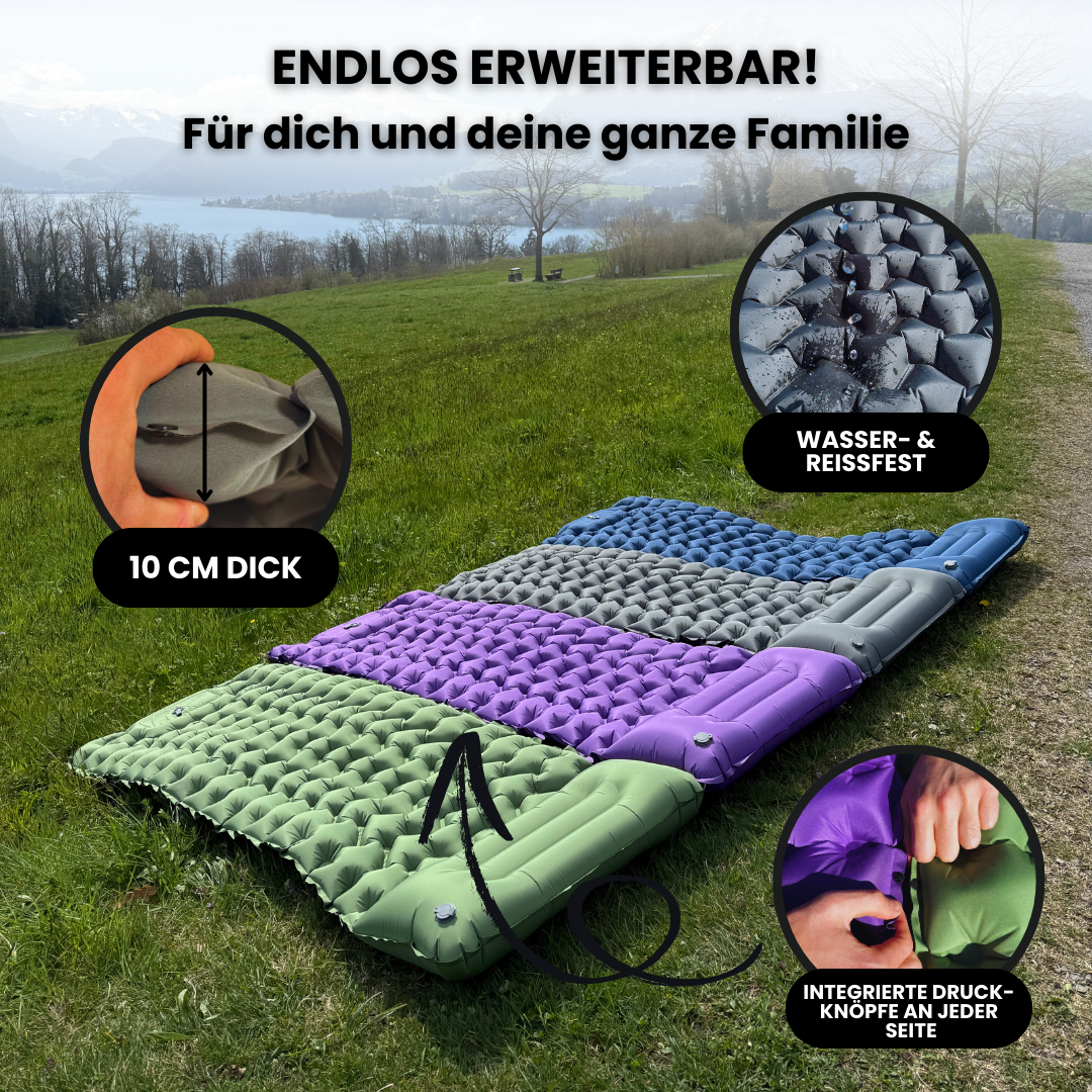 So viele du willst. Mit den seitlichen Druckknöpfen lassen sich unendlich viele Outdoormatten miteinander verbinden