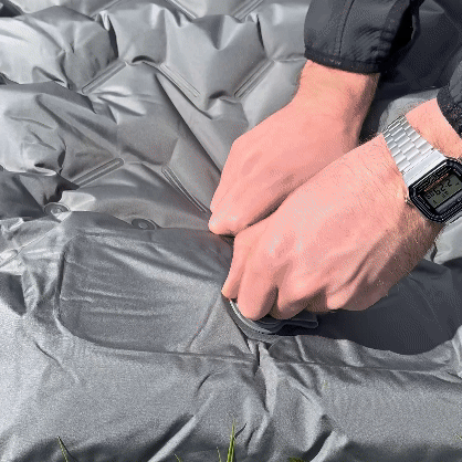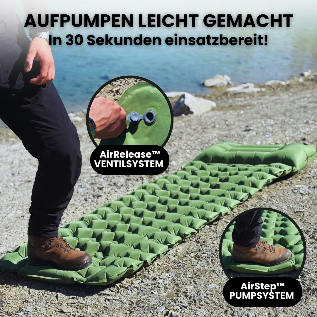Einfach mit dem Fuss auf die integrierte Luftpumpe treten – nach ca. 30 Sekunden ist die Matte einsatzbereit